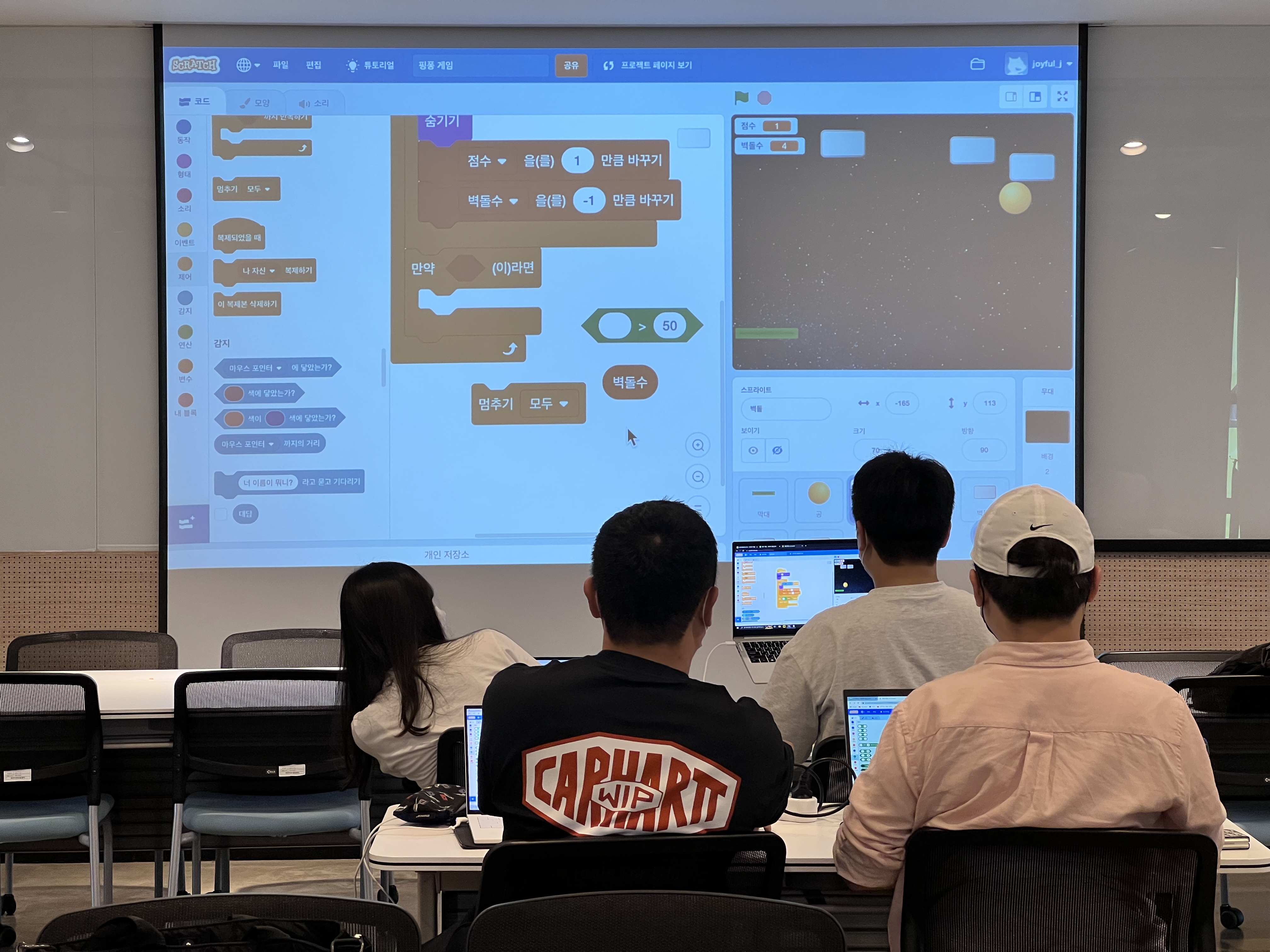 1회때와 마찬가지로 코딩에 대해 배워본적이 없는 청년들을 대상으로 진행되었고 우려했던 것과는 다르게 즐거운 분위기에서 수업이 진행되었습니다. 두 번의 수업을 하면서 느낀 점은 코딩 교육을 받아 본 적이 없는 청년들이 코딩 교육에 대해 궁금해 하고 경험해보고 싶어 한다는 점입니다. 개발자가 진로인 교육생들이 아니더라도 교양 과목 같은 느낌으로 코딩에 접근한다면 그들에게도 충분히 신선하고 재미있는 수업이 된다는 것을 알았습니다.