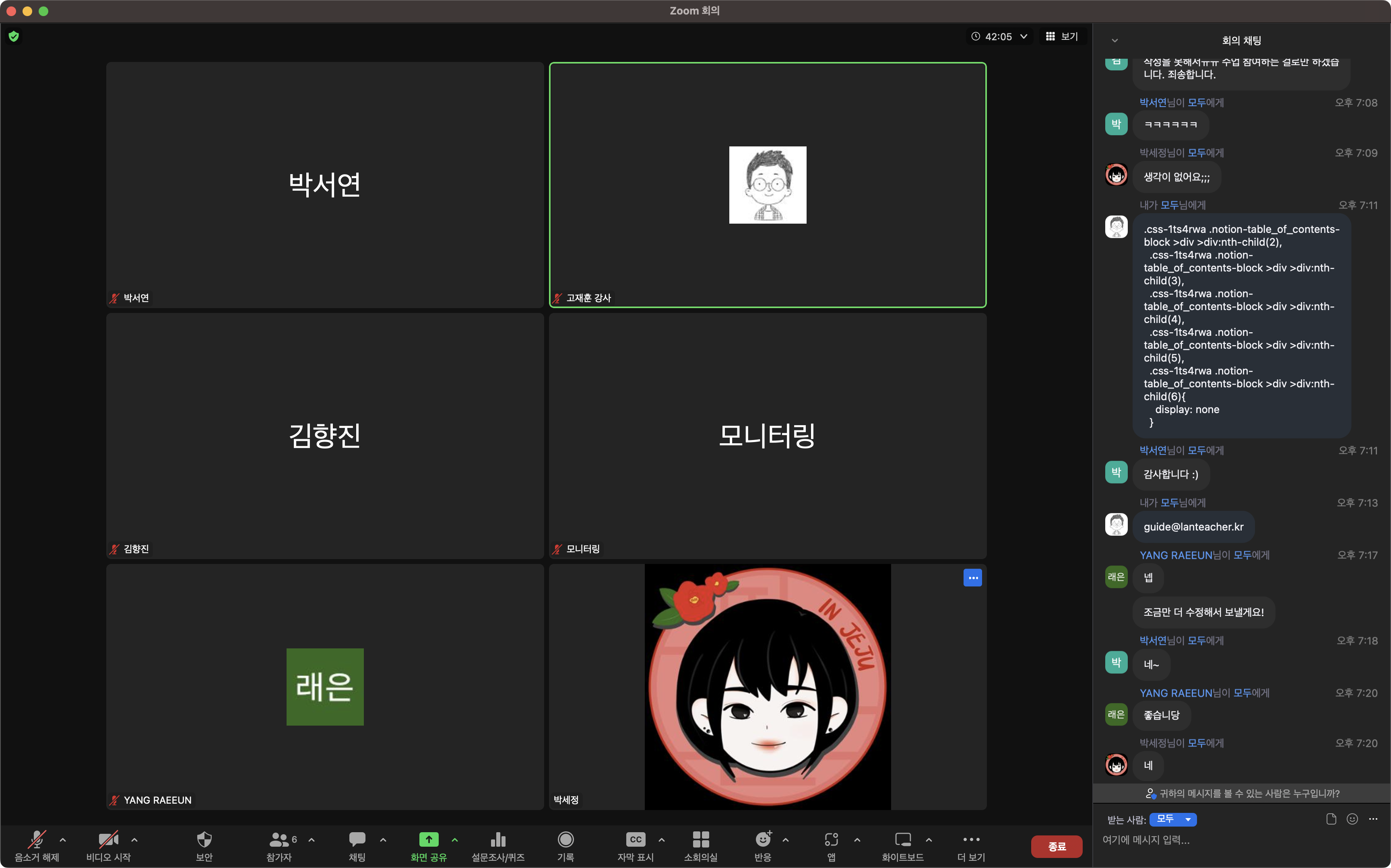 마지막 수업은 개인별로 웹포트폴리오를 완성하면서 우피에서 CSS, JavaScript 작업에 어려움을 겪는 경우가 많이 있는데 줌으로 하다보니 원격제어를 통해 개별적으로 코드를 확인해주기에는 더 수월한 부분도 있었습니다. 덕분에 마지막 수업에 참여한 네명의 수강생들 모두 자신의 노션 웹포트폴리오를 완성할 수 있었습니다.