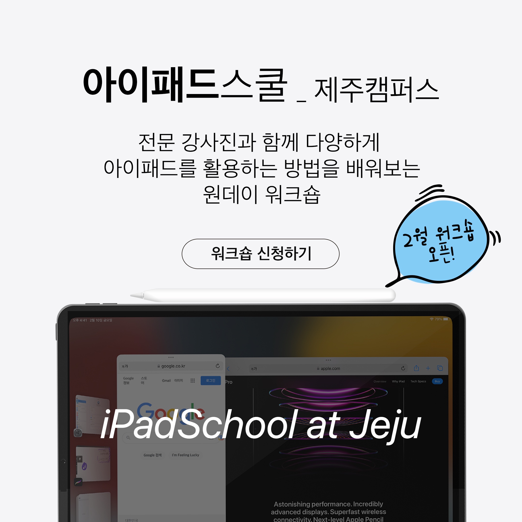 | [종료] "iPad 사진앱을 활용하여 나만의 스타일로 사진 보정하기" 수강 신청 오픈 - 아이패드스쿨 제주캠퍼스 4월 워크숍 (0) | 2023.04.18 |