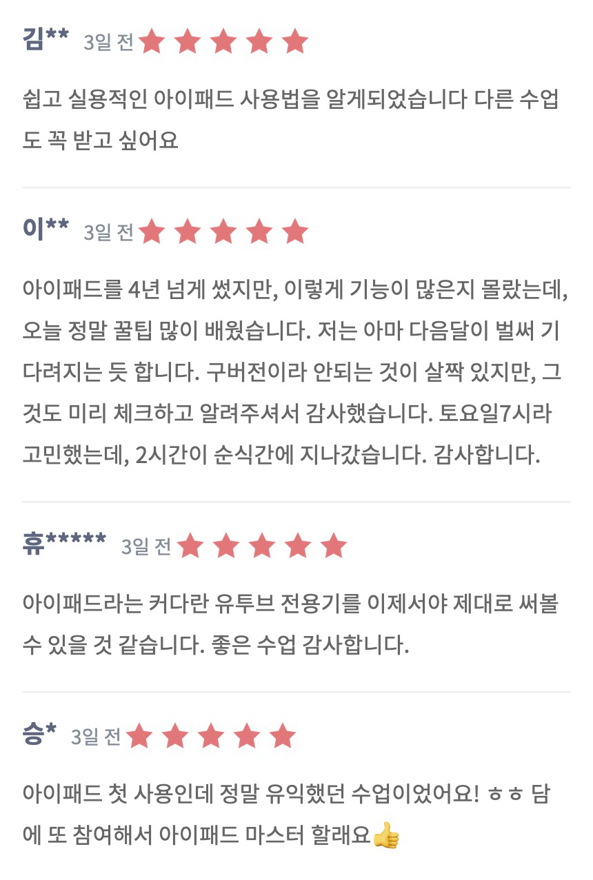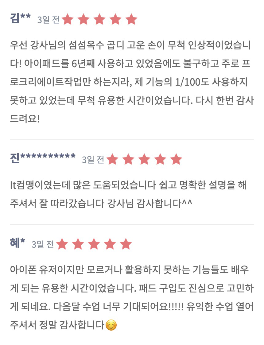 워크숍 내용을 기반으로 다양한 내용을 더해서 아이패드스쿨 VOD로 만들어질 예정이니 수업에 참여 못하셨던 분들도 랜티처 클래스에 회원가입을 해두시면 알림을 받아보실 수 있습니다.