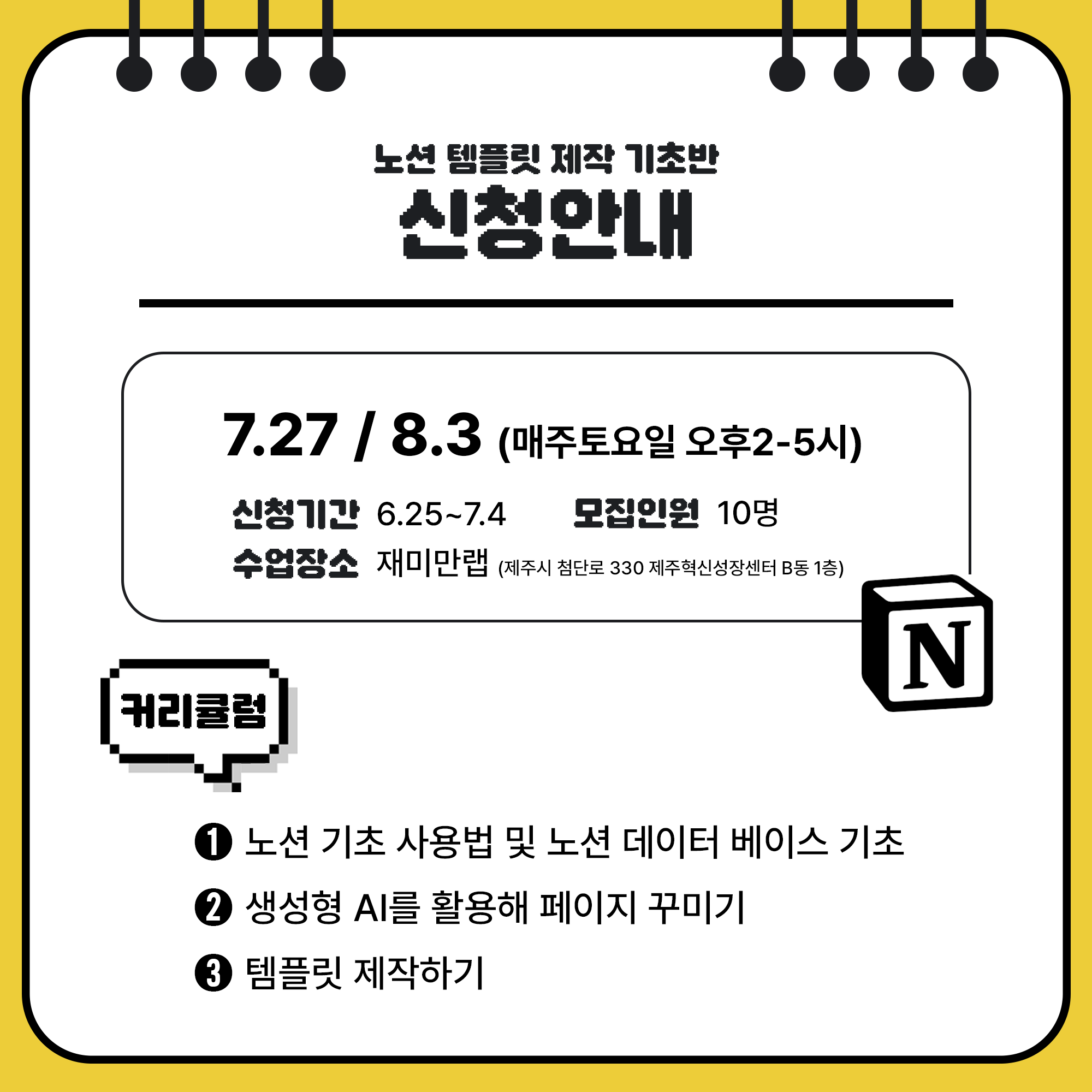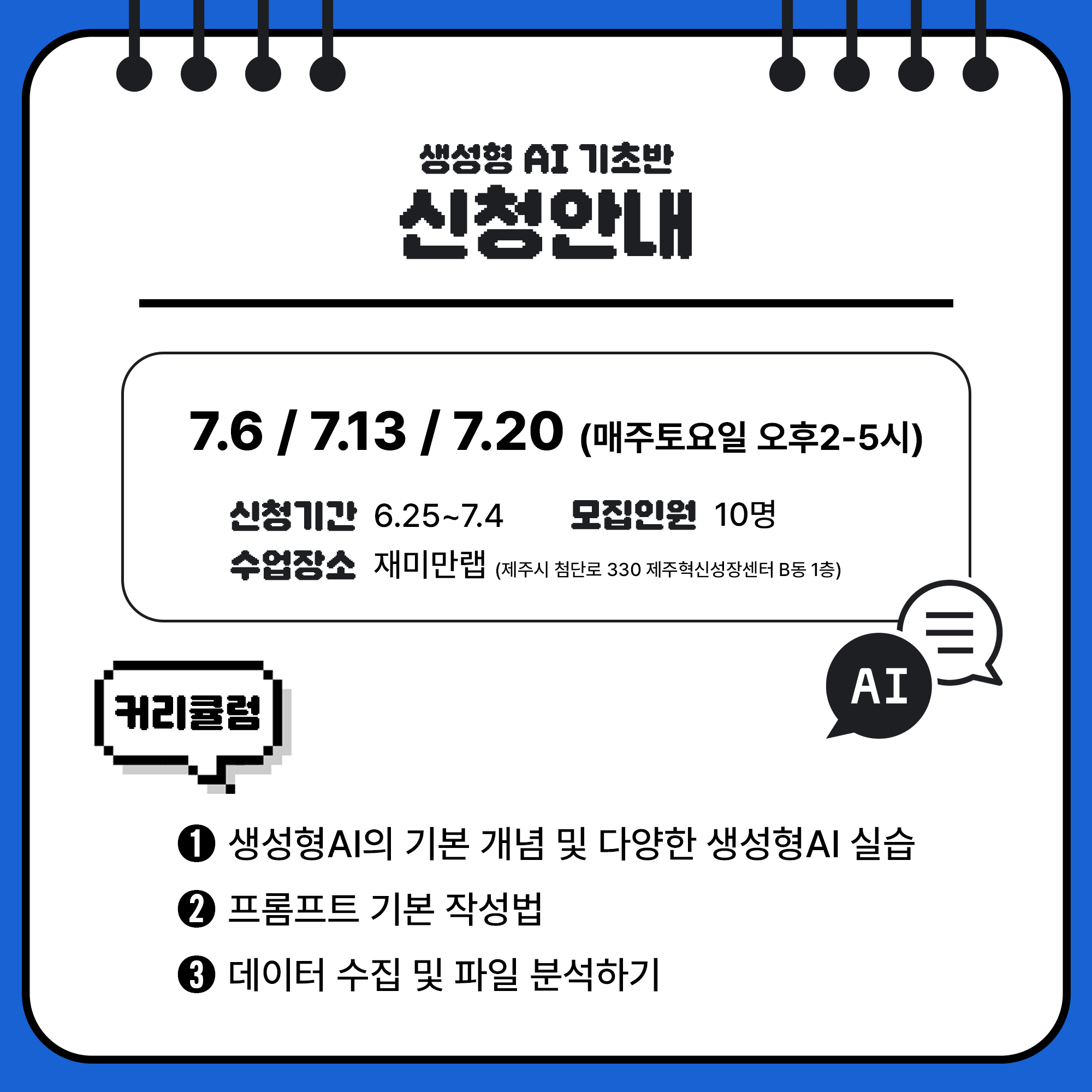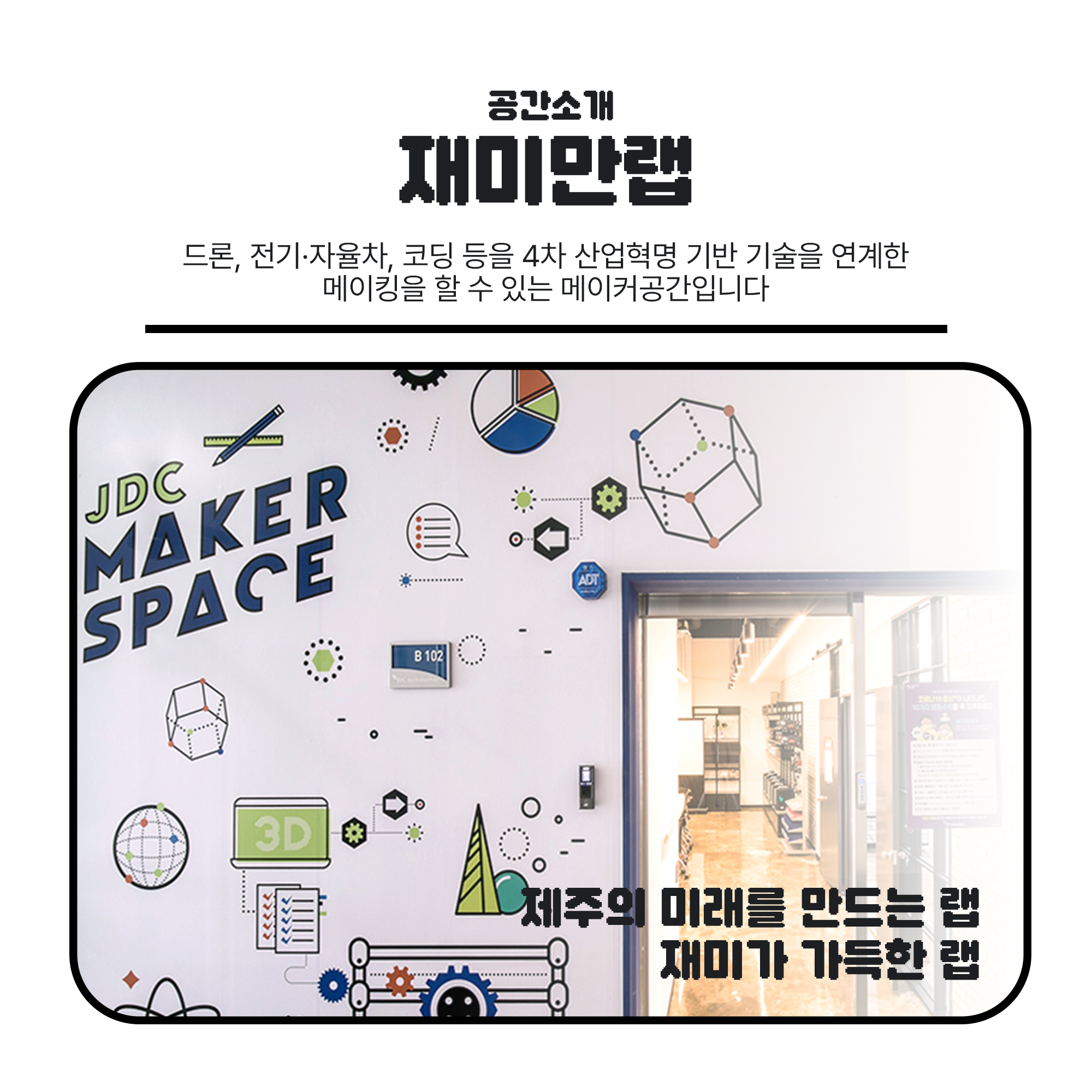 - 교육장소 : 재미만랩(제주시 첨단로 330 제주혁신성장센터 B동 1층) 지도보기